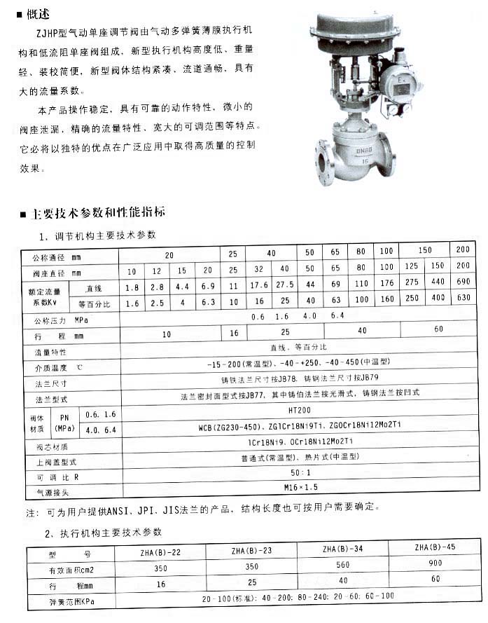 ZJHP型氣動單座調(diào)節(jié)閥由氣動多彈簧薄膜執(zhí)行機(jī)構(gòu)和低流阻單座閥組成。新型執(zhí)行機(jī)構(gòu)高度低、重量輕、裝校簡便,新型閥體結(jié)構(gòu)緊湊、流道通暢,具有大的流量系數(shù)。